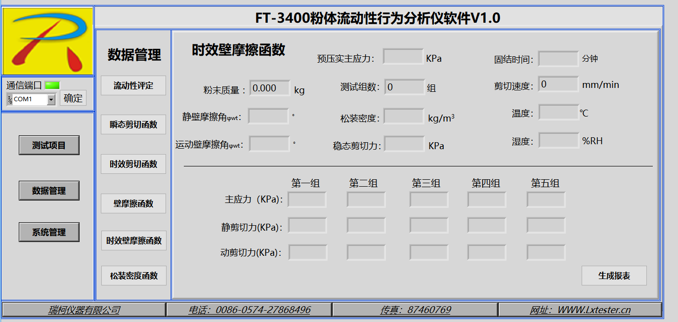 分析和測試如下數(shù)據(jù):莫爾應(yīng)力圓、內(nèi)摩擦角、主應(yīng)力、剪切力、屈服軌跡、穩(wěn)態(tài)流、流動函數(shù)、開放屈服強(qiáng)度(無側(cè)限屈服強(qiáng)度)、內(nèi)摩擦?xí)r間角、時效屈服軌跡、堆積密度、密度軌跡、壁摩擦角、附著力、壁剪切力、壁應(yīng)力、壁軌跡、運(yùn)動摩擦角、靜態(tài)摩擦角、料倉設(shè)計(jì)的料斗半頂角、卸料口徑、流與不流判定、流動因子、初始抗剪強(qiáng)度(內(nèi)聚力)等數(shù)據(jù)分析.